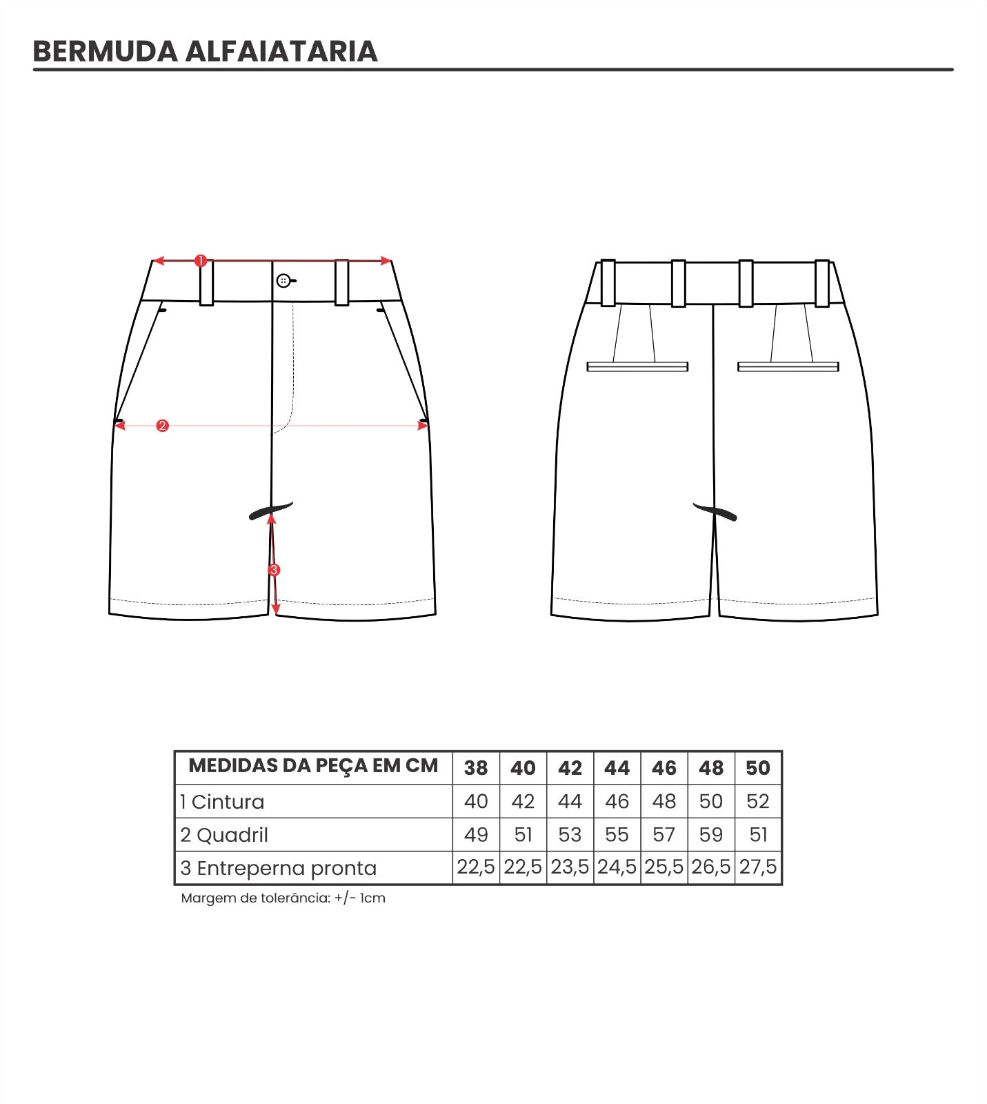 A peça possui cós com passantes, bolsos frontais do tipo faca, bolsos posteriores embutidos, fechamento frontal por zíper e botão, acabamento barra simples em pespontos